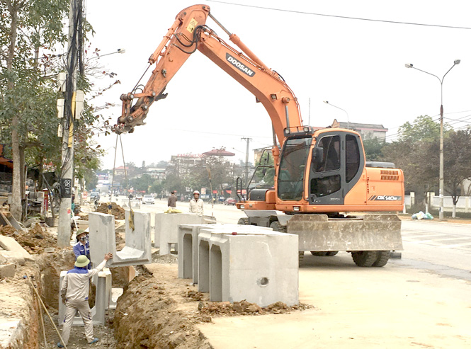 ông nhân Công ty TNHH Đầu tư và Xây dựng Thành Hưng thi đua lao động sản xuất hướng về Đại hội. Ảnh: Thu Hương