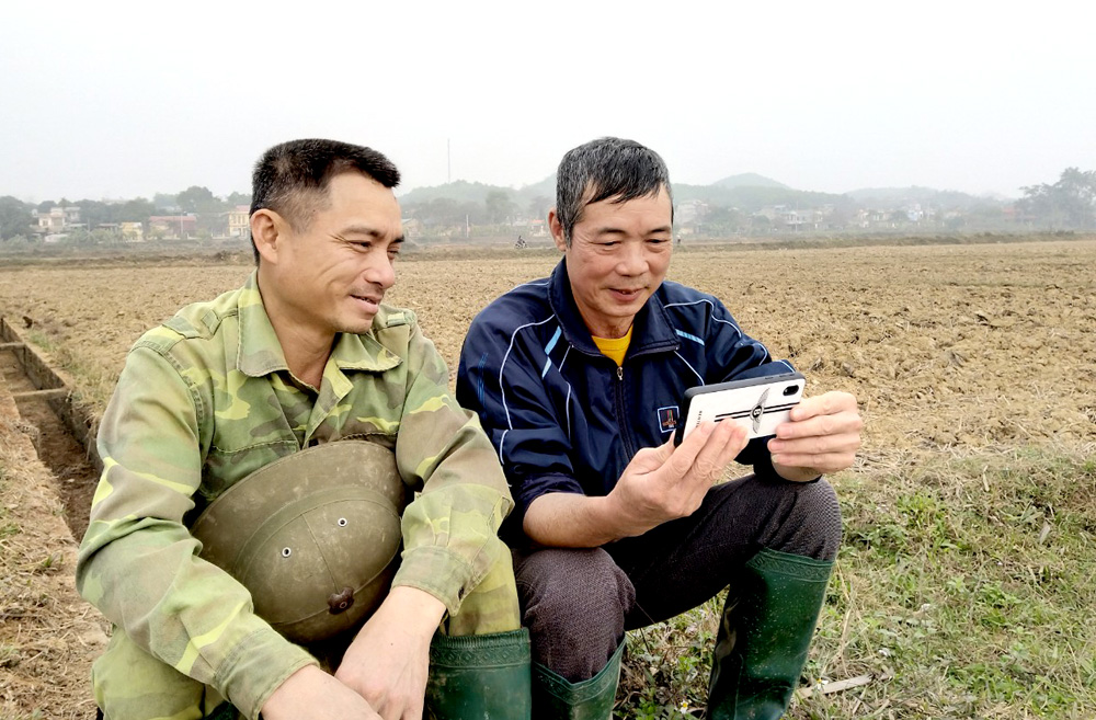 Người dân xã Kim Phú tranh thủ thời gian nghỉ theo dõi diễn biến Đại hội Đảng qua điện thoại.