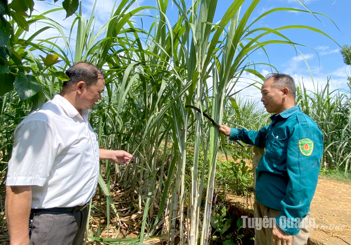 Đồng chí Vương Ngọc Vản (bên trái), Chủ tịch UBND xã Bình Yên thăm vườn mía của người dân.