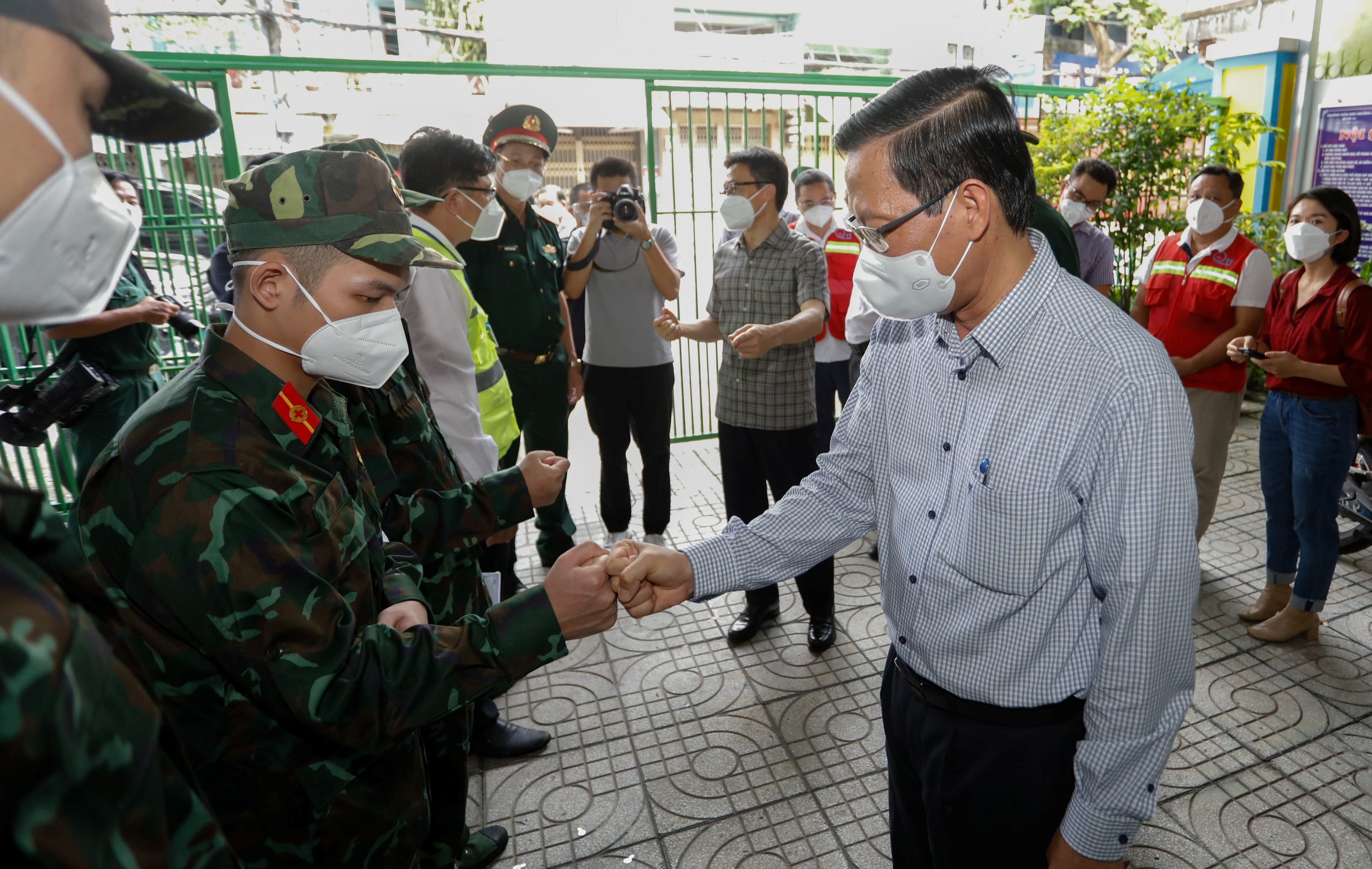 Tập trung xây dựng đội ngũ cán bộ các cấp, nhất là cấp chiến lược đủ phẩm chất, năng lực và uy tín, ngang tầm nhiệm vụ, năng động, sáng tạo, dám nghĩ, dám làm, dám chịu trách nhiệm vì lợi ích chung (Trong ảnh: Ủy viên Trung ương Đảng, Chủ tịch Ủy ban nhân dân Thành phố Hồ Chí Minh Phan Văn Mãi thăm hỏi, động viên và thể hiện quyết tâm cao chiến thắng đại dịch COVID-19 cùng lực lượng tuyến đầu chống dịch tại phường 6, Quận 11, Thành phố Hồ Chí Minh)_Ảnh: dantri.com.vn