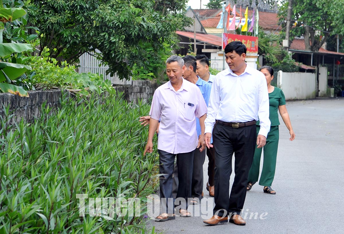 Đồng chí Dương Chí Thành (ngoài cùng bên phải), Bí thư Đảng ủy xã Sơn Nam (Sơn Dương) là cán bộ luân chuyển từ xã Ninh Lai, kiểm tra tiến độ xây dựng nông thôn mới nâng cao thôn Thác Nóng.