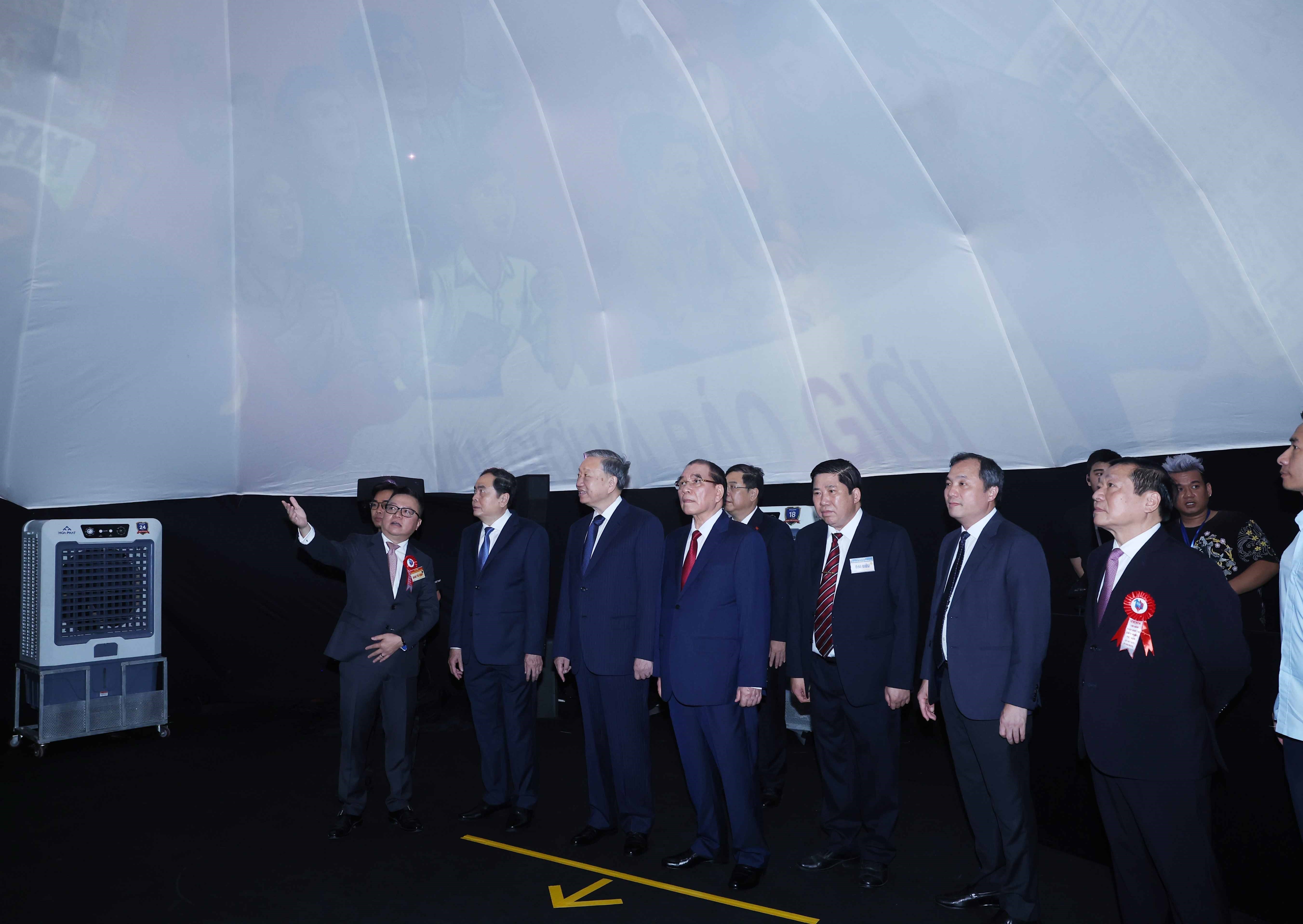 Tổng Bí thư Tô Lâm cùng các đồng chí lãnh đạo Đảng, Nhà nước và đại biểu tham quan triển lãm ảnh, tư liệu, hiện vật lịch sử về truyền thống 100 năm Ngày Báo chí Cách mạng Việt Nam; thành tựu xu hướng phát triển báo chí trong kỷ nguyên mới; trưng bày các thiết bị, ứng dụng công nghệ báo chí - truyền thông hiện đại_Ảnh: TTXVN