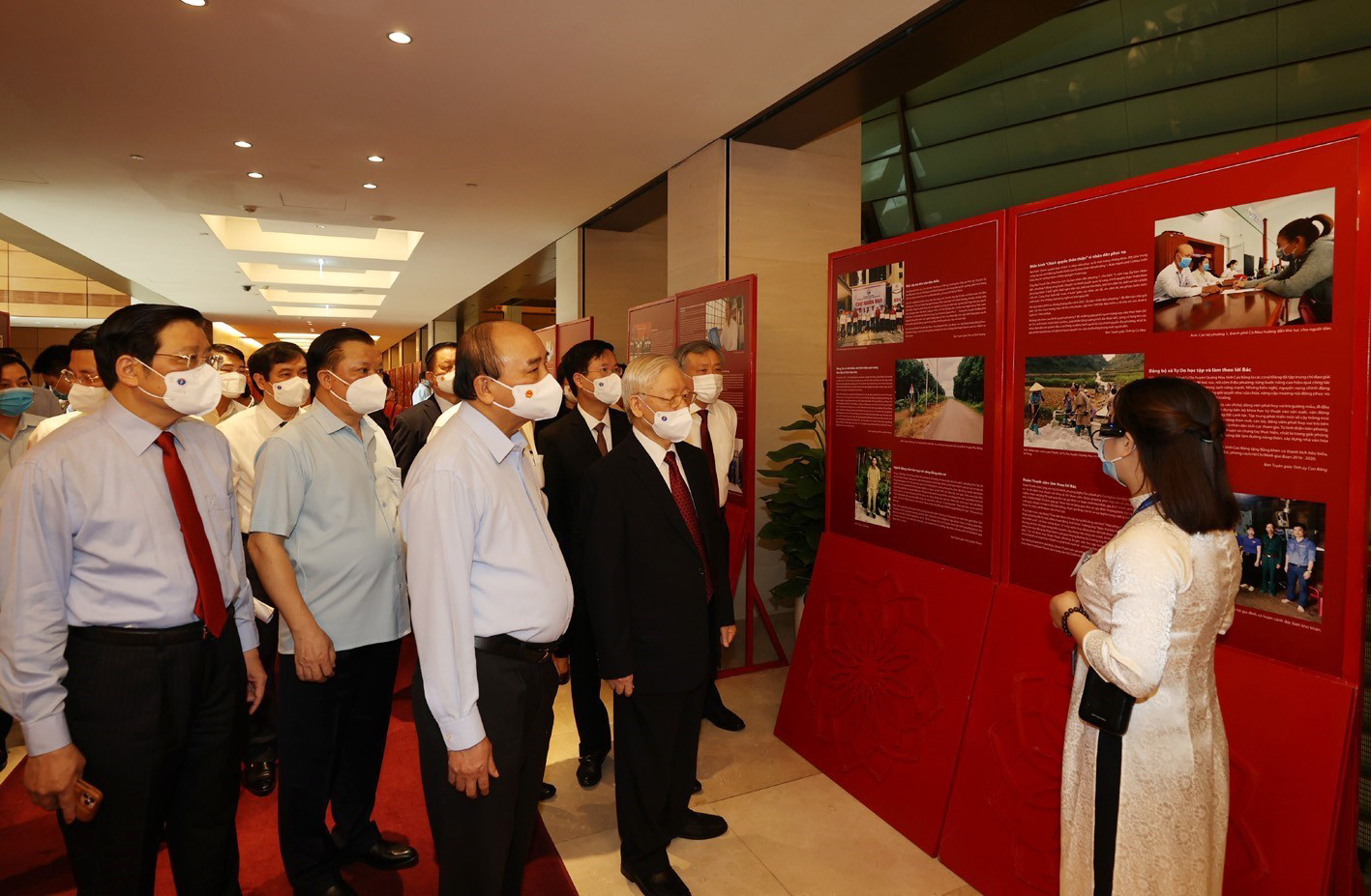 Tổng Bí thư Nguyễn Phú Trọng cùng các đồng chí lãnh đạo Đảng, Nhà nước và các đại biểu thăm Triển lãm “Những tấm gương bình dị mà cao quý” trưng bày bên sảnh Hội nghị toàn quốc sơ kết 5 năm thực hiện Chỉ thị 05-CT/TW “Về đẩy mạnh học tập và làm theo tư tưởng, đạo đức, phong cách Hồ Chí Minh” _Ảnh : TTXVN