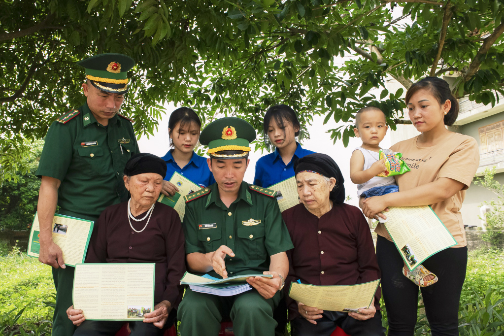 Cán bộ, chiến sĩ Đồn Biên phòng Quảng Đức (huyện Hải Hà, tỉnh Quảng Ninh) tuyên truyền phổ biến chủ trương của Đảng và pháp luật của Nhà nước tới nhân dân_Nguồn: baoquangninh.com.vn