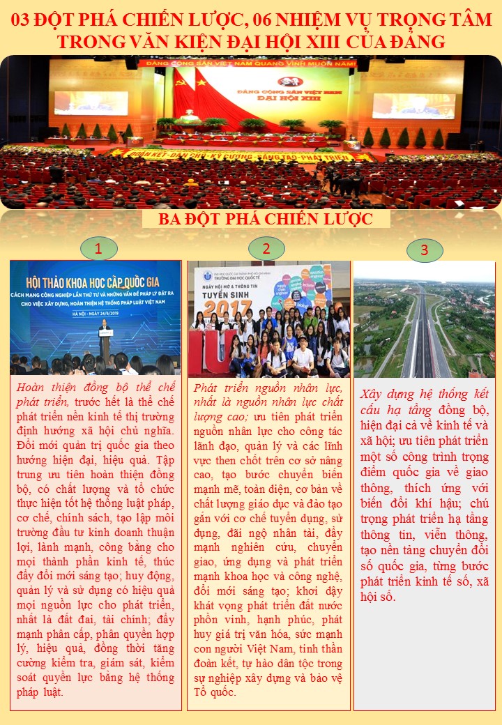 Để thực hiện thắng lợi các mục tiêu đến năm 2025, năm 2030 và đến năm 2045, Đại hội XIII của Đảng đã đề ra 03 đột phá chiến lược, 06 nhiệm vụ trọng tâm