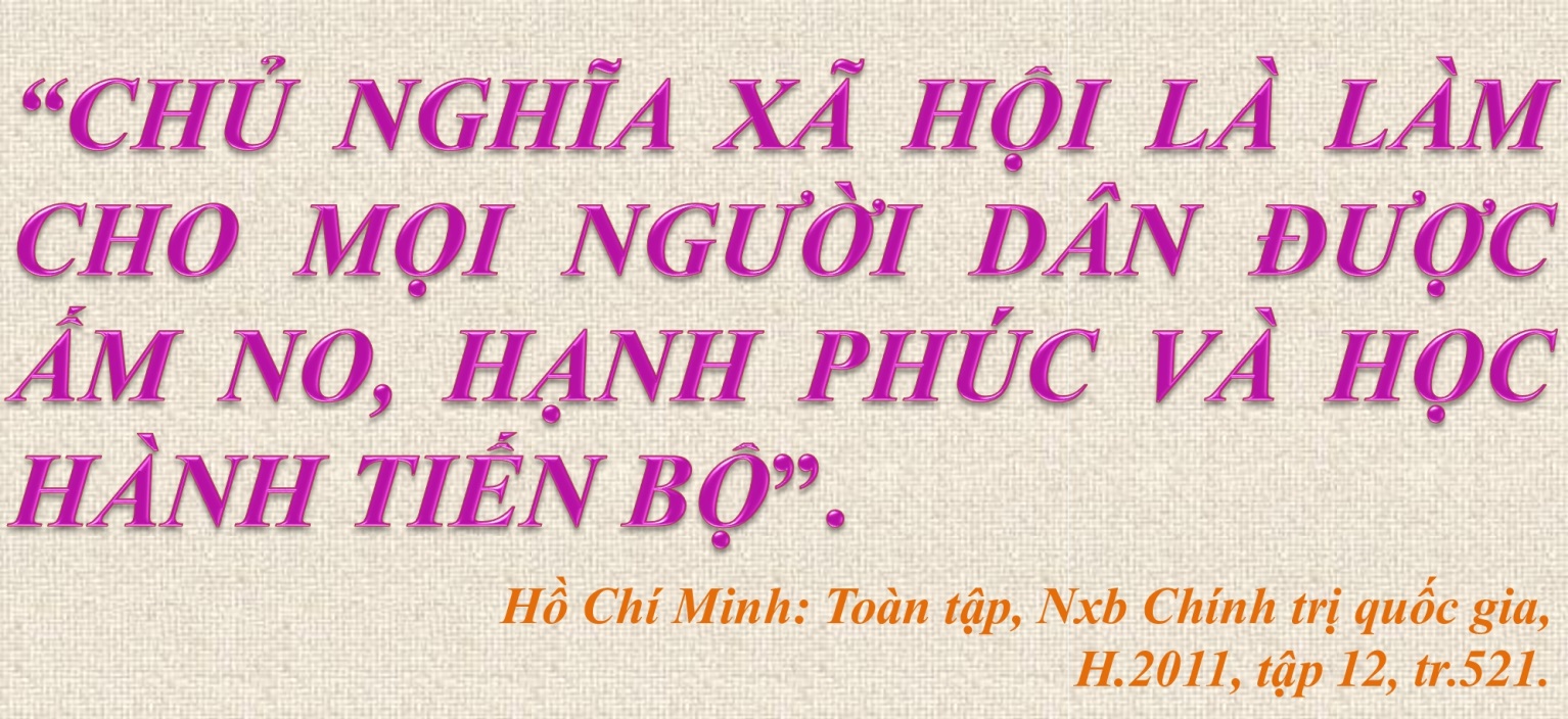 Trong bối cảnh quốc tế và khu vực hiện nay có nhiều chuyển biến mau chóng, phức tạp, ý nghĩa của câu nói “Chủ nghĩa xã hội là làm cho mọi người dân được ấm no, hạnh phúc và học hành tiến bộ” vẫn còn nguyên giá trị, vẫn là mục tiêu lý tưởng của Đảng, Nhà nước và nhân dân ta hướng tới. Bởi theo quan điểm của Chủ tịch Hồ Chí Minh, mục tiêu cao nhất của chủ nghĩa xã hội là nâng cao đời sống vật chất và tinh thần của nhân dân; sự nghiệp đấu tranh cách mạng để giải phóng dân tộc, giải phóng giai cấp và xây dựng chế độ xã hội mới, giàu mạnh, dân chủ, công bằng, văn minh xét đến cùng là vì hạnh phúc, vì sự phát triển toàn diện của con người.