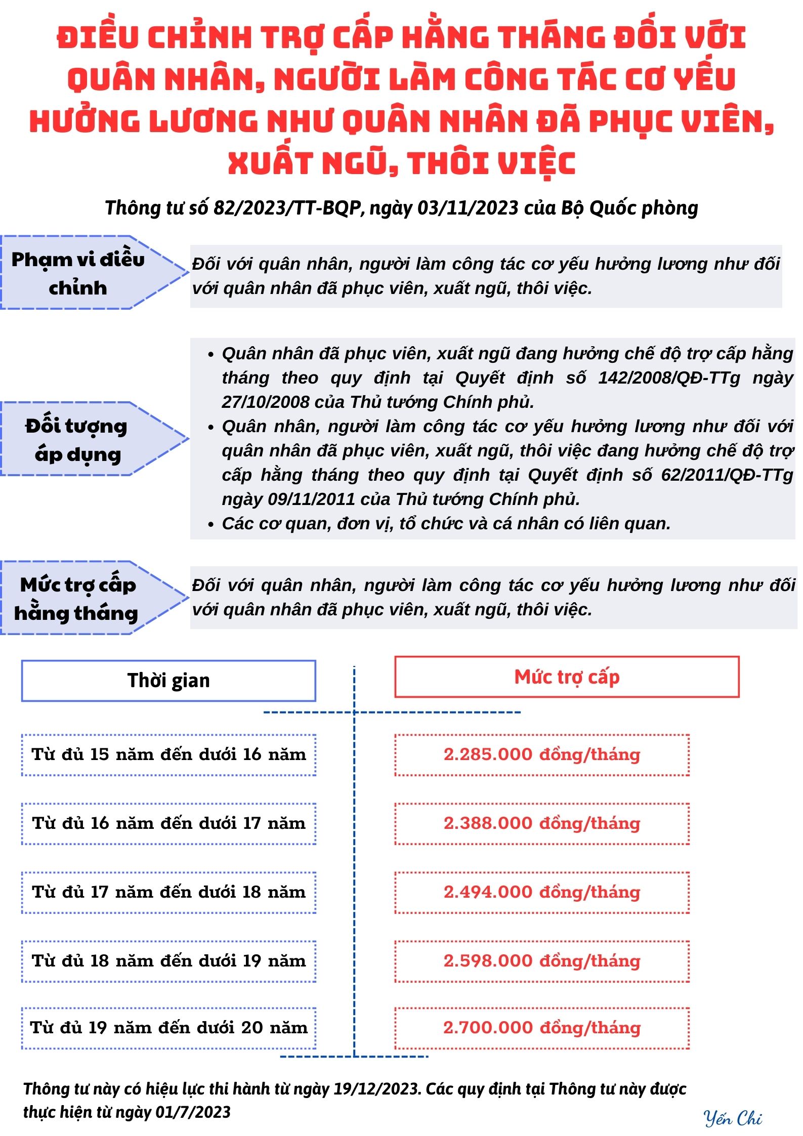 Ngày 03/11/2023 Bộ Quốc phòng ban hành Thông tư số 82/2023/TT-BQP quy định điều chỉnh trợ cấp hằng tháng đối với quân nhân, người làm công tác cơ yếu hưởng lương như đối với quân nhân đã phục viên, xuất ngũ, thôi việc, trong đó phạm vi điều chỉnh, đối tượng áp dụng, mức trợ cấp hằng tháng cụ thể như sau: