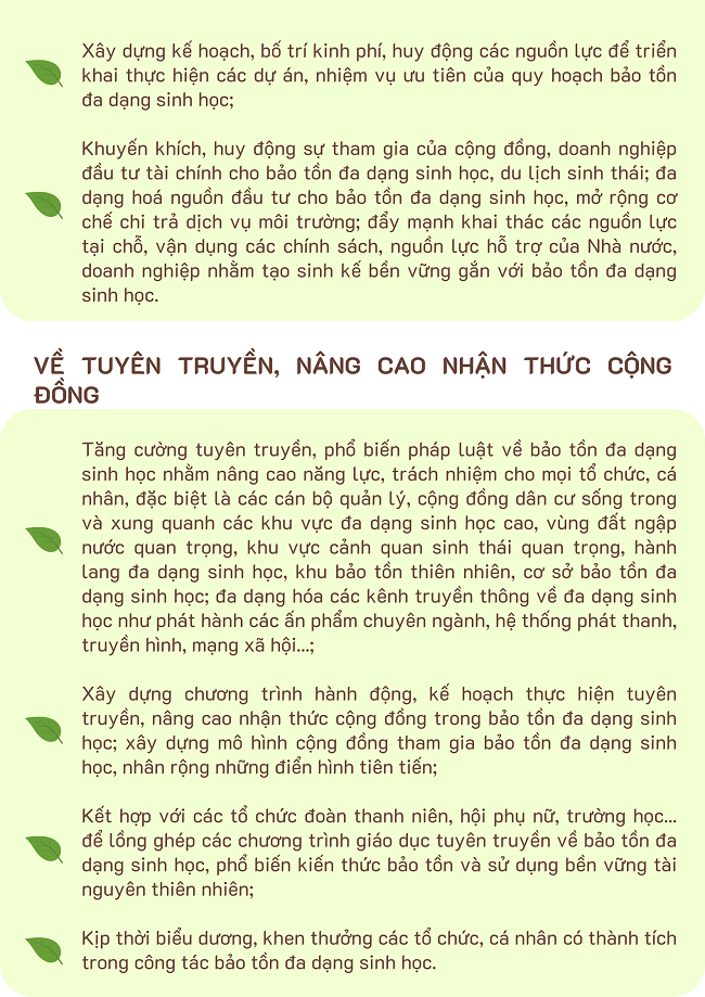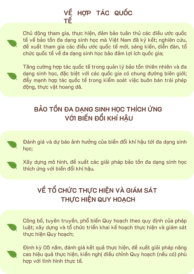 Ngày 08/11/2024, Thủ tướng Chính phủ ban hành Quyết định số 1352/QĐ-TTg phê duyệt quy hoạch bảo tồn đa dạng sinh học quốc gia thời kỳ 2021 - 2030, tầm nhìn đến năm 2050 với giải pháp như sau: