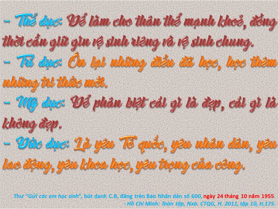 Sinh thời, Chủ tịch Hồ Chí Minh luôn quan tâm và chăm lo đến sự nghiệp giáo dục và đào tạo nước nhà. Trong thư “Gửi các em học sinh”, nhân dịp khai giảng năm học mới, với bút danh C.B, đăng trên Báo Nhân dân số 600, ngày 24 tháng 10 năm 1955, Người viết: Nước ta mới giải phóng được một năm, chế độ cũ của thực dân và phong kiến không khỏi còn để lại ít nhiều ảnh hưởng không tốt trong những đầu óc trẻ non. Vậy chúng ta phải dùng tinh thần và đạo đức mới để rửa gọt những ảnh hưởng ấy. Đối với các em, việc giáo dục gồm có: