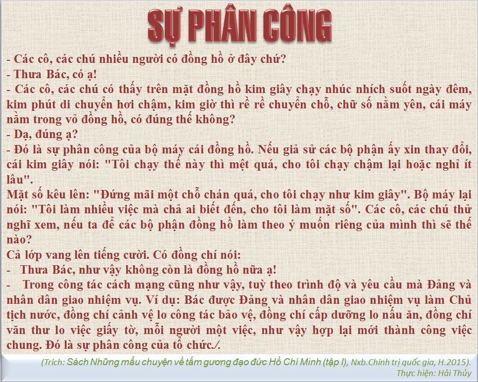 Đồng thời Người còn căn dặn: Các em cần rèn luyện cái đức tính thành thật và dũng cảm. Ở trường, thì kính thầy, yêu bạn, đoàn kết và giúp đỡ lẫn nhau. Ở nhà, thì yêu kính và giúp đỡ cha mẹ. Ở xã hội, thì tuỳ sức mình mà tham gia những việc có ích lợi chung.