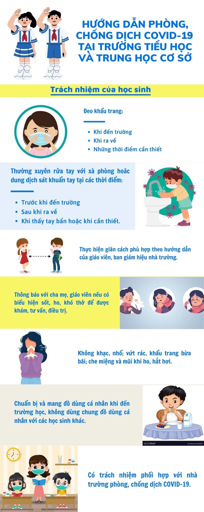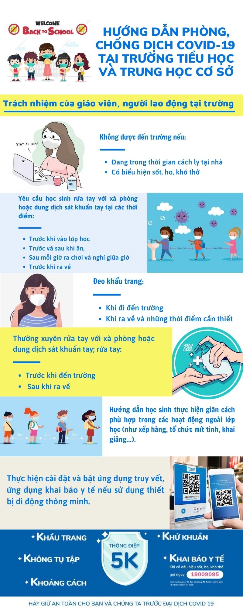 Trước diễn biến và tình hình phức tạp của dịch Covid-19 như hiện nay, việc đảm bảo về sức khoẻ cho học sinh tại trường học là vấn đề hết sức quan trọng. Để trẻ trong độ tuổi học sinh Tiểu học và Trung học cơ sở đến trường an toàn trước dịch bệnh, Bộ Y tế đã ban hành Sổ tay Hướng dẫn công tác phòng, chống dịch Covid-19 tại các cơ sở giáo dục trong tình hình mới; trong đó nêu rõ trách nhiệm của Ban Giám hiệu, cán bộ, giáo viên, cha mẹ và học sinh cần thực hiện tại trường Tiểu học và Trung học cơ sở .