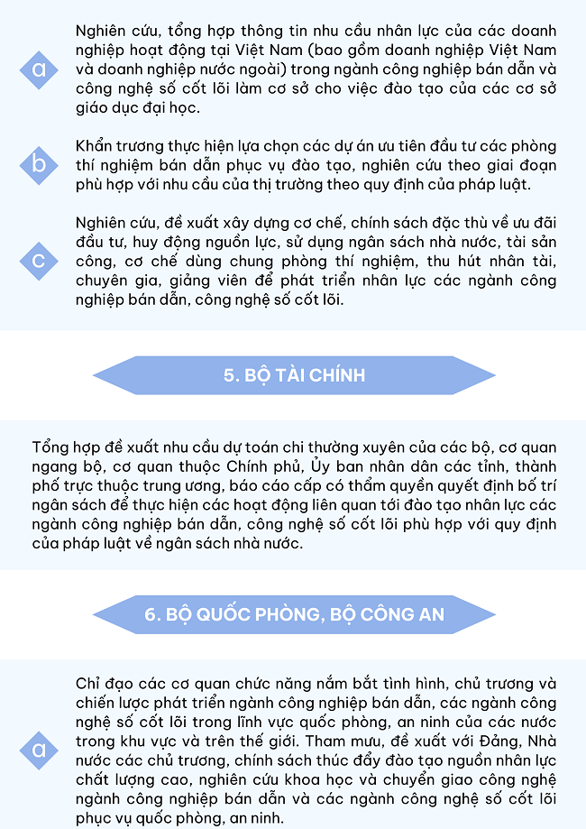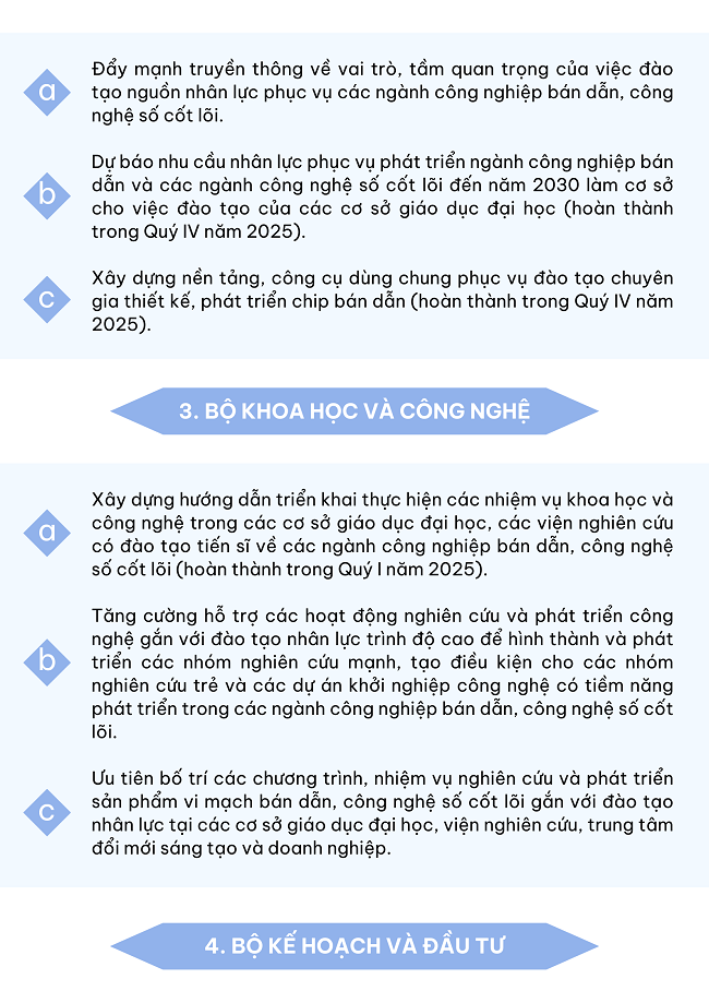Ngày 04/12/2024, Thủ tướng Chính phủ ban hành Chỉ thị 43/CT-TTg đẩy mạnh đào tạo nhân lực cho ngành công nghiệp bán dẫn và một số ngành công nghệ số cốt lõi với một số nhiệm vụ như sau: