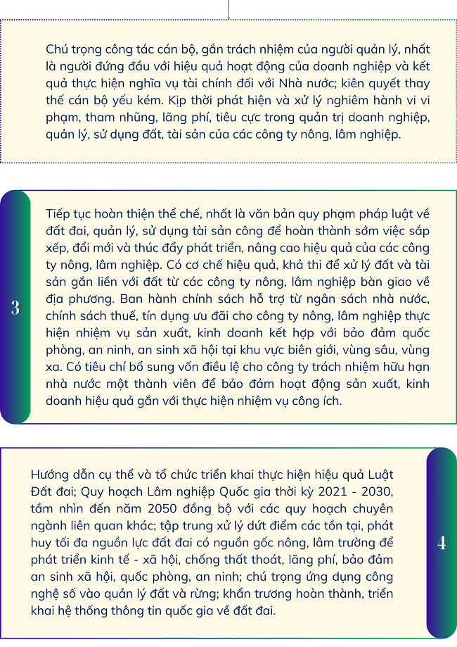 Ngày 02/12/2024, Bộ Chính trị ban hành Kết luận số 103-KL/TW về tiếp tục thực hiện Nghị quyết số 30-NQ/TW, ngày 12/3/2014 của Bộ Chính trị về tiếp tục sắp xếp, đổi mới và phát triển, nâng cao hiệu quả hoạt động của công ty nông, lâm nghiệp, với một số nhiệm vụ trọng tâm sau: