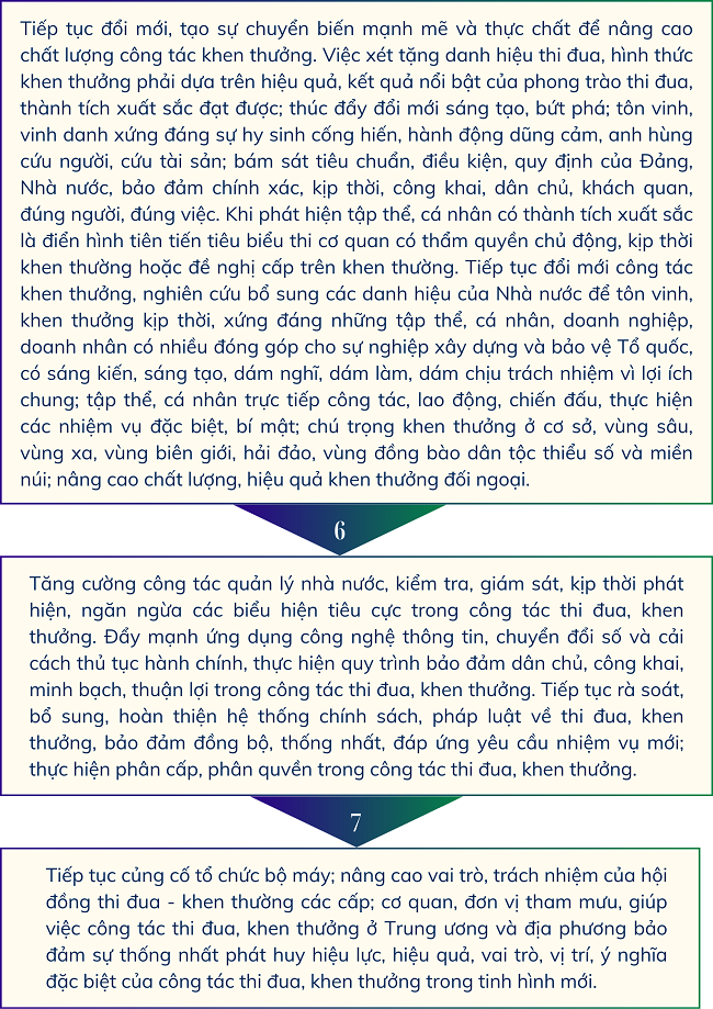 Ngày 26/12/2024, Bộ Chính trị ban hành Chỉ thị số 41-CT/TW về tăng cường sự lãnh đạo của Đảng công tác thi đua, khen thưởng trong tình hình mới, với một số nhiệm vụ và giải pháp sau: