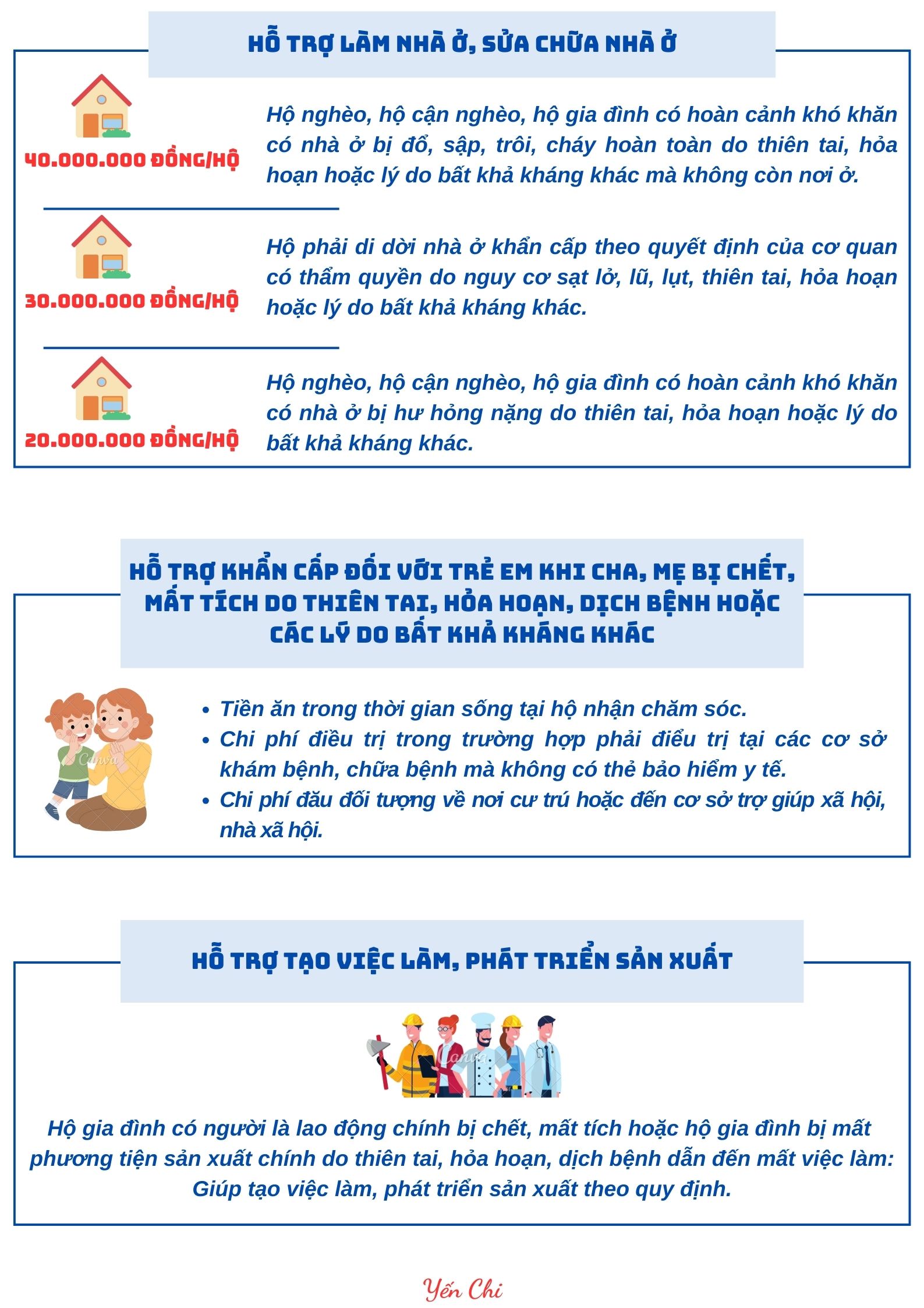 Theo Nghị định số 20/2021/NĐ-CP, ngày 15/3/2021 của Chính phủ quy định chính sách trợ giúp xã hội đối với đối tượng bảo trợ xã hội, trong đó quy định về trợ giúp xã hội khẩn cấp, người dân bị thiệt hại do thiên tai sẽ được hỗ trợ về lương thực và nhu yếu phẩm thiết yếu, chi phí điều trị người bị thương năng, hỗ trợ làm nhà ở và sửa chữa nhà.