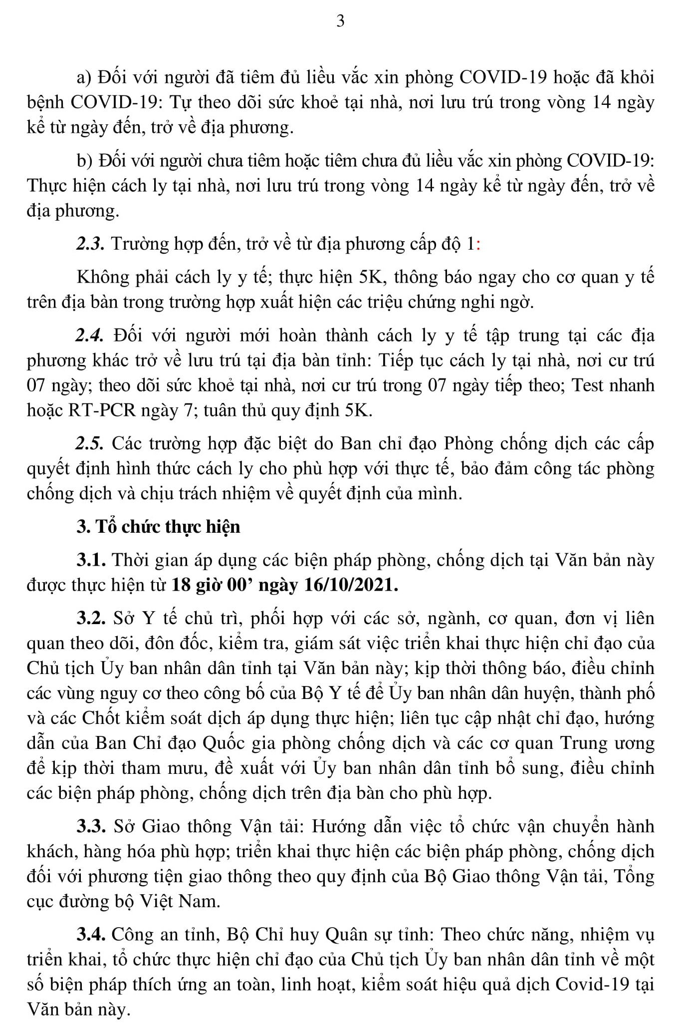 Đối với xe vận chuyển hành khách theo tuyến cố định đi qua địa bàn tỉnh: từ các tỉnh có cấp độ dịch 1, 2 cần có giấy tờ chứng minh theo tuyến đi qua tỉnh và được phép dừng đỗ đón, trả khách; từ các tỉnh có cấp độ dịch 3, 4 cần có giấy tờ chứng minh theo tuyến đi qua tỉnh, thực hiện khai báo y tế, không được phép dừng đỗ đón, trả khách.