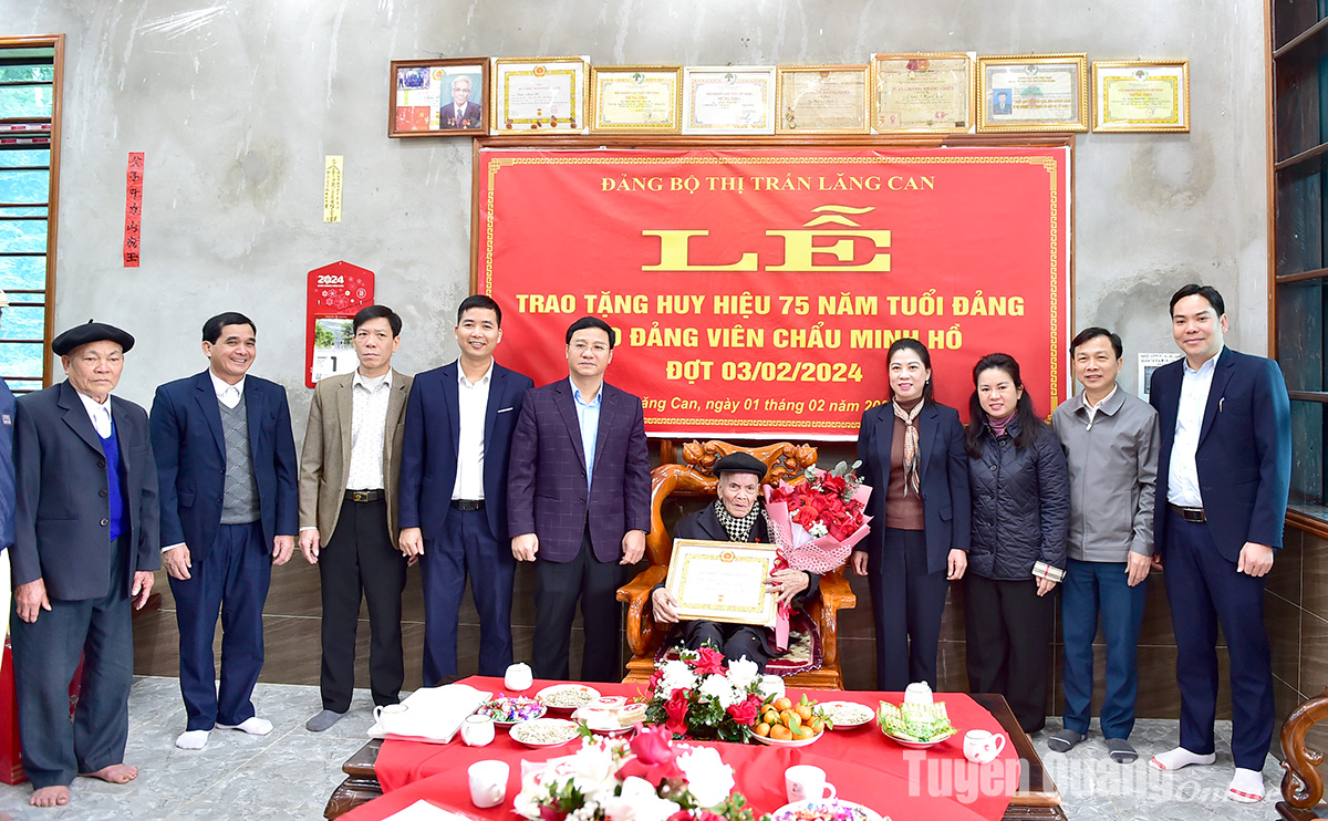 Sáng 1-2, đồng chí Lê Thị Kim Dung, Phó Bí thư Thường trực Tỉnh ủy, Chủ tịch HĐND tỉnh đã trao Huy hiệu 75 tuổi Đảng cho đảng viên Chẩu Minh Hồ, sinh năm 1927, Chi bộ tổ dân phố Nặm Đíp, thị trấn Lăng Can (Lâm Bình).