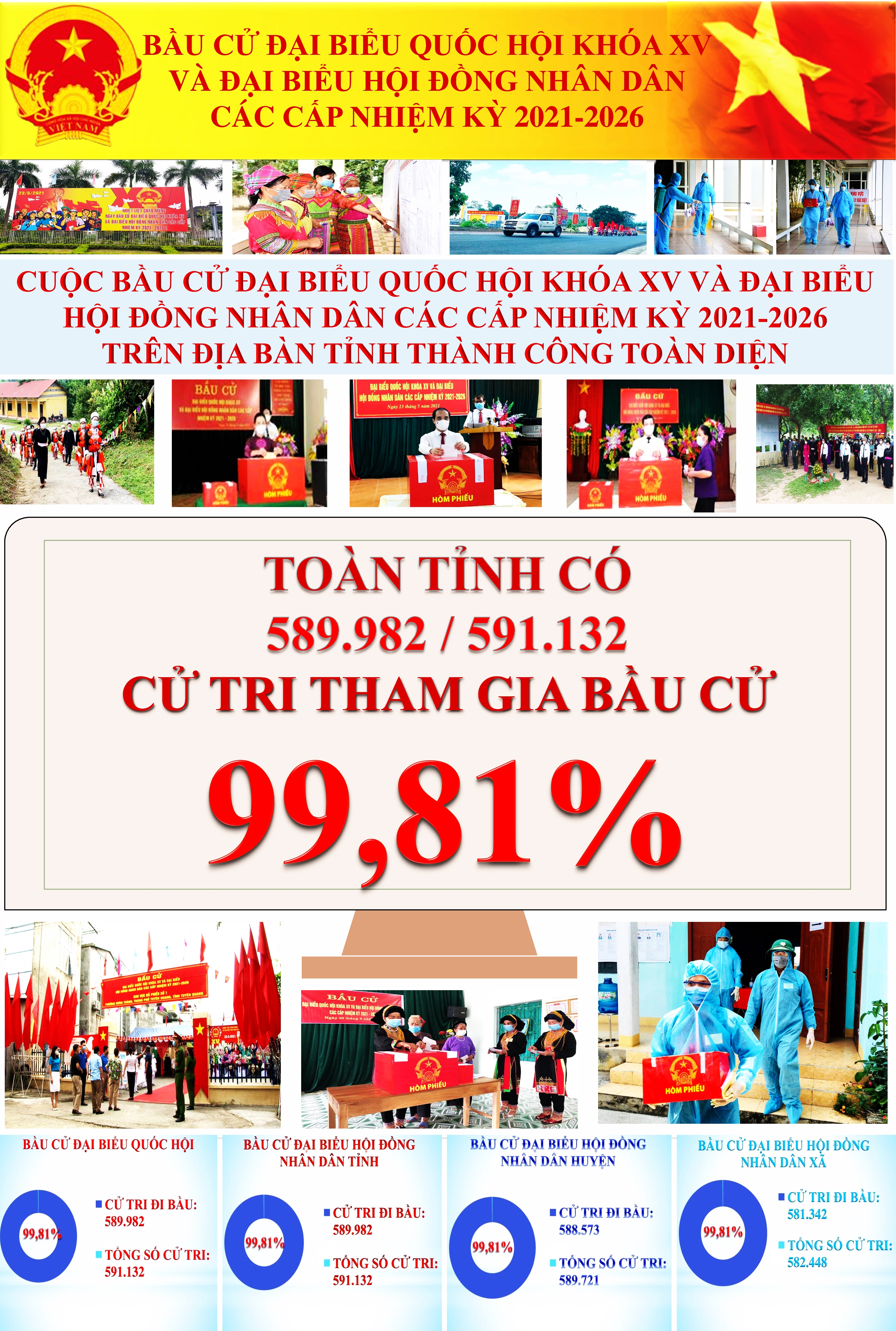 Toàn tỉnh đã có 589.982/591.132 cử tri tham gia bầu cử, đạt 99,81%, có 107/138 xã và 1.269/1.342 khu vực bỏ phiếu có 100% cử tri đi bầu. Huyện Lâm Bình và huyện Sơn Dương có 100% cử tri đi bầu.