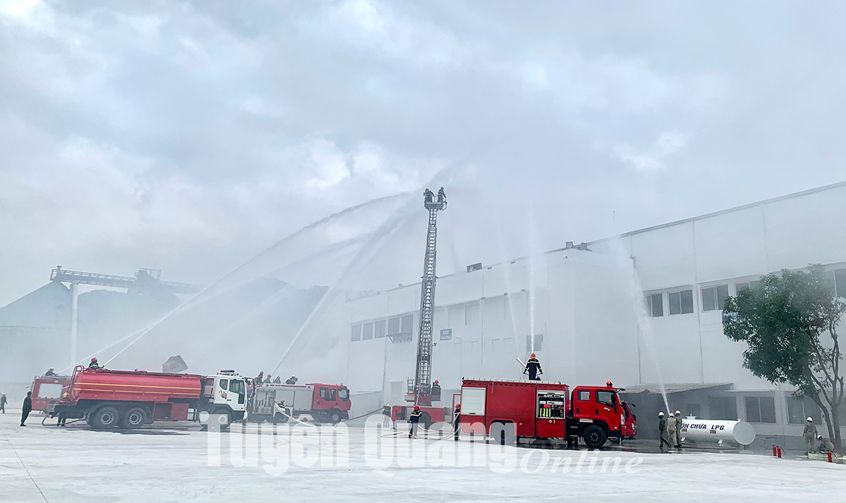Cuộc diễn tập huy động nhiều lực lượng với 600 người, cùng 35 xe chuyên dụng các loại. Phần diễn tập thực binh theo tình huống giả định, xảy ra cháy tại phân xưởng giấy, Công ty cổ phần Giấy An Hòa do hệ thống điện bị chập, phát sinh các tia lửa điện bắn vào khu vực để giấy thành phẩm, đám cháy đã nhanh chóng lan rộng. Do tác động của ngọn lửa, nhiệt độ cao, khói khí độc và đám cháy phát triển nhanh khiến nhiều công nhân viên bị thương và mắc kẹt. Phần diễn tập được tiến hành qua 4 giai đoạn với các phương án xử lý tình huống cụ thể gồm: Giai đoạn 1 là lực lượng PCCC cơ sở và Đội PCCC chuyên ngành phát huy phương châm “4 tại chỗ” hướng dẫn thoát nạn, cứu người, cứu tài sản và tổ chức chữa cháy. Giai đoạn 2: Lực lượng Cảnh sát PCCC và cứu nạn, cứu hộ gần nhất và chính quyền địa phương tìm kiếm người bị nạn và ngăn chặn không để cháy lan, lực lượng chữa cháy chuyên nghiệp Phòng Cảnh sát PCCC và cứu nạn cứu hộ đến chi viện chữa cháy, cứu nạn, cứu hộ. Giai đoạn 3 là các đơn vị nghiệp vụ thuộc Công an tỉnh đến tham gia hỗ trợ công tác chữa cháy và cứu nạn, cứu hộ. Giai đoạn 4 là phát huy sức mạnh tổng hợp, đồng bộ giữa các đơn vị chữa cháy và cứu nạn, cứu hội tổ chức tìm kiếm nạn nhân, cấp cứu, tổ chức điều tra và khắc phục hậu quả vụ cháy.