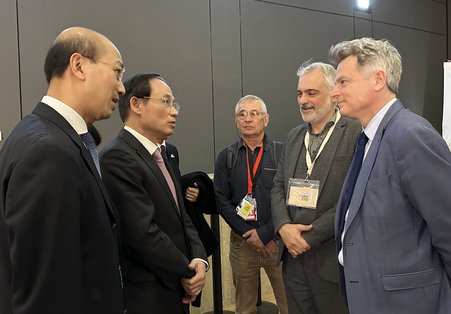 Ủy viên Trung ương Đảng, Trưởng Ban Đối ngoại Trung ương Đảng Cộng sản Việt Nam Lê Hoài Trung (thứ hai, bên trái) trao đổi với đồng chí Fabien Roussel, Bí thư toàn quốc Đảng Cộng sản Pháp (thứ nhất, bên phải) tại Marseilles, bên lề Đại hội Đảng Cộng sản Pháp lần thứ 39, ngày 7-4-2023_Ảnh: TTXVN