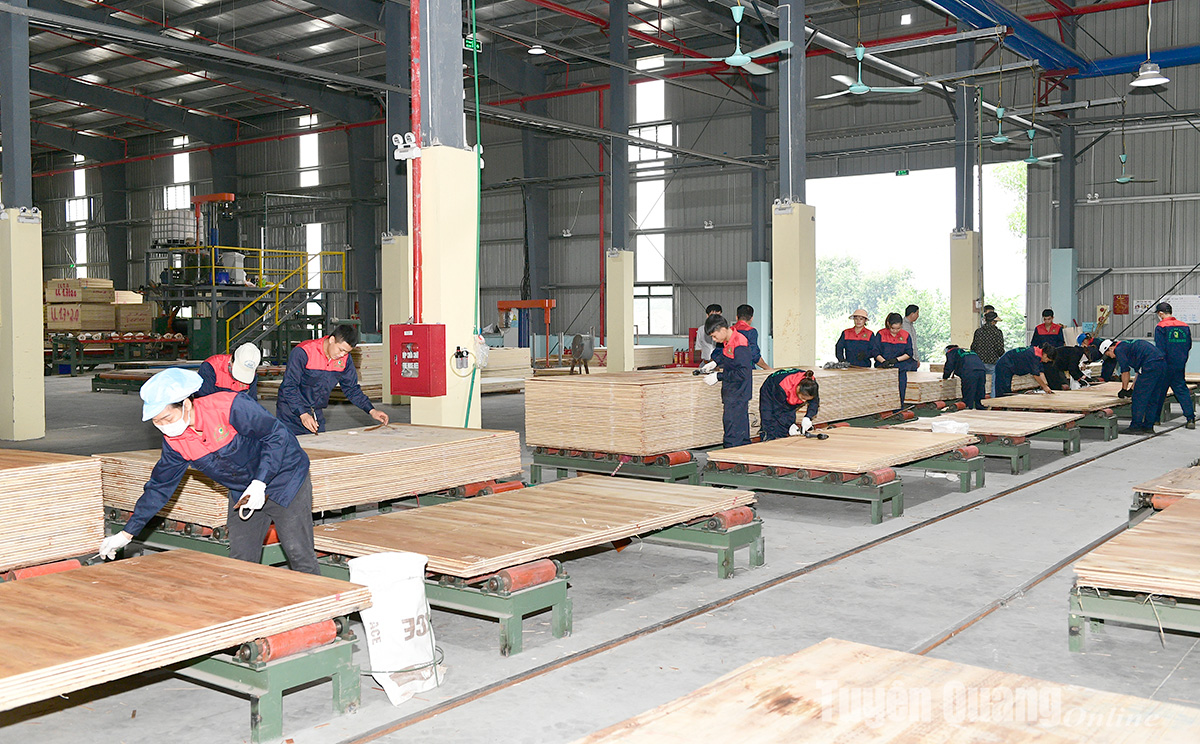 Công nhân Công ty TNHH Sao Việt Tuyên Quang sản xuất gỗ ép xuất khẩu.