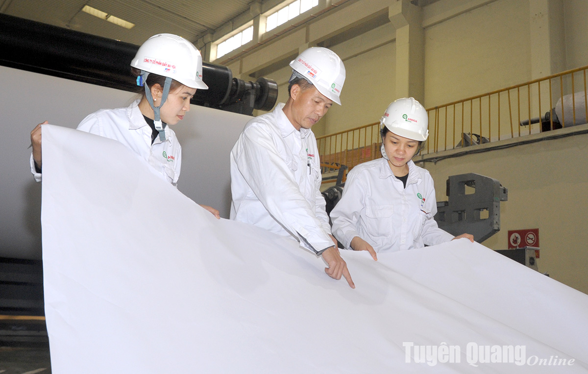 Công nhân kiểm tra chất lượng sản phẩm giấy tại Nhà máy Giấy An Hòa.