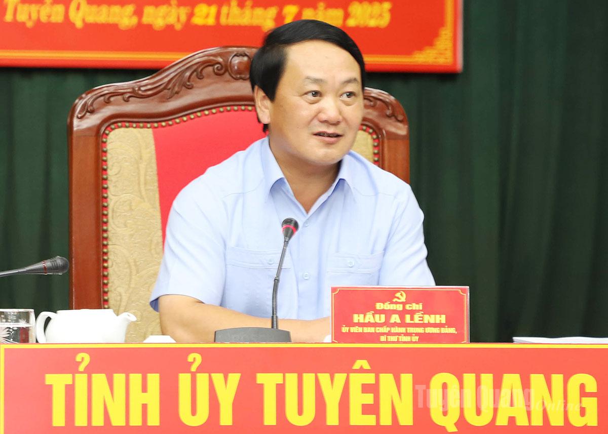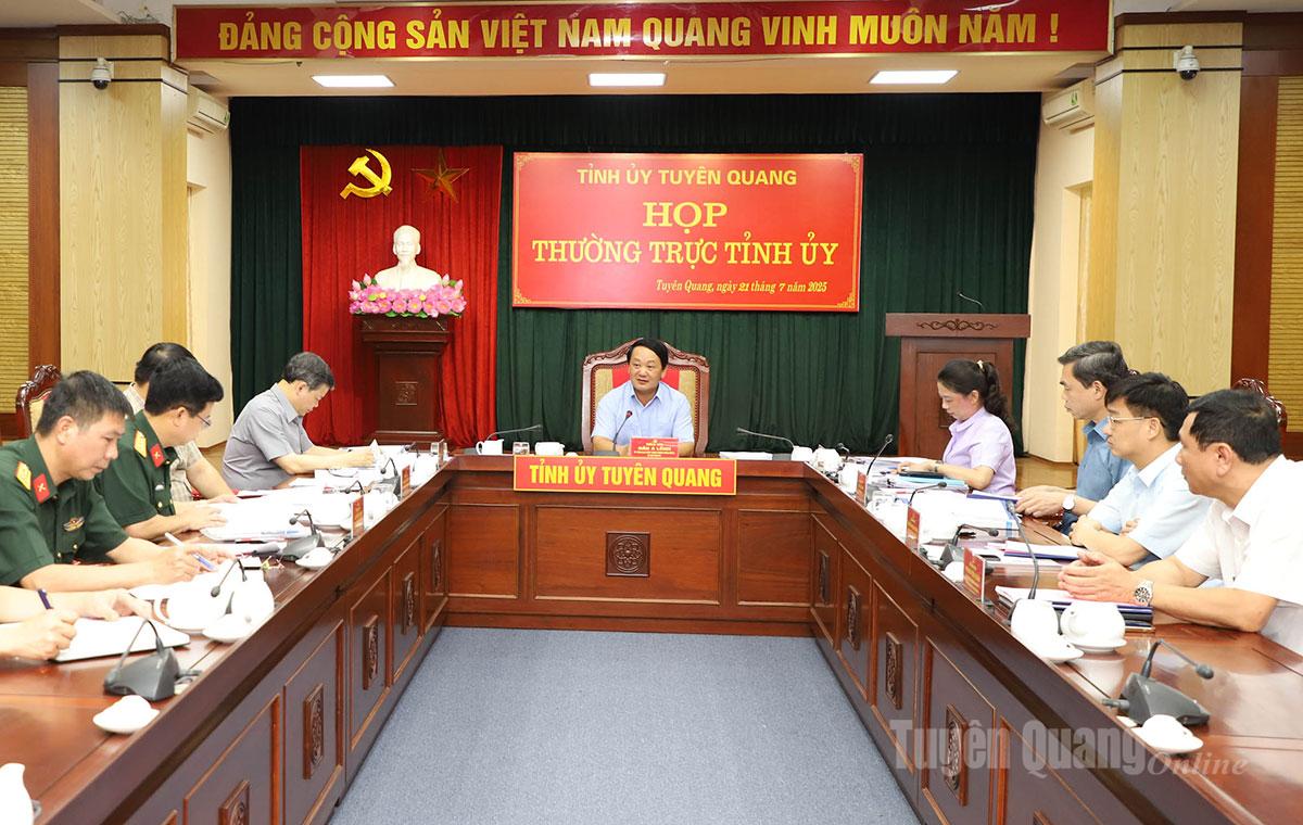 Chiều 21-7, dưới sự chủ trì của đồng chí Hầu A Lềnh, Ủy viên BCH Trung ương Đảng, Bí thư Tỉnh ủy, Bí thư Đảng ủy Quân sự tỉnh, Thường trực Tỉnh ủy đã họp, cho ý kiến vào Văn kiện trình Đại hội đại biểu Đảng bộ Quân sự tỉnh Tuyên Quang nhiệm kỳ 2025-2030. Cùng dự có các đồng chí: Lê Thị Kim Dung, Phó Bí thư Thường trực Tỉnh ủy; Nguyễn Văn Sơn, Phó Bí thư Tỉnh ủy, Chủ tịch HĐND tỉnh; Phan Huy Ngọc, Phó Bí thư Tỉnh ủy, Chủ tịch UBND tỉnh; Ma Thế Hồng, Phó Bí thư Tỉnh ủy, Chủ tịch Ủy ban MTTQ tỉnh Tuyên Quang; lãnh đạo Ban Tổ chức, Ban Nội chính Tỉnh ủy.