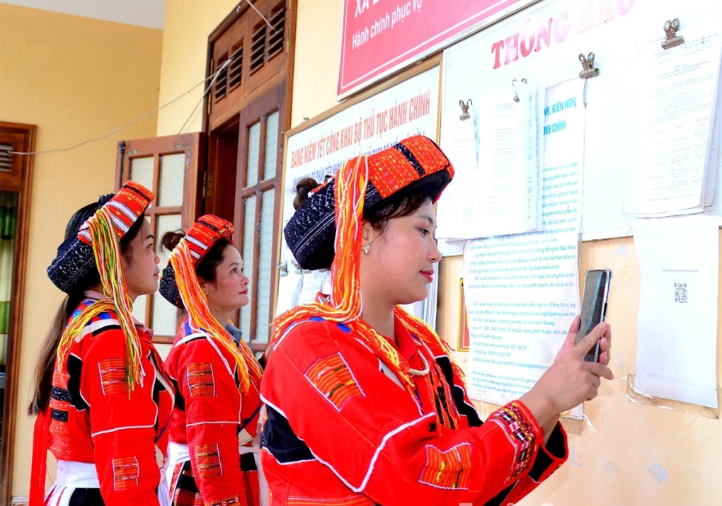 Người dân quét mã QR dán tại Bộ phận tiếp nhận và trả kết quả giải quyết TTHC xã Linh Phú, huyện Chiêm Hóa (Ảnh khai thác)